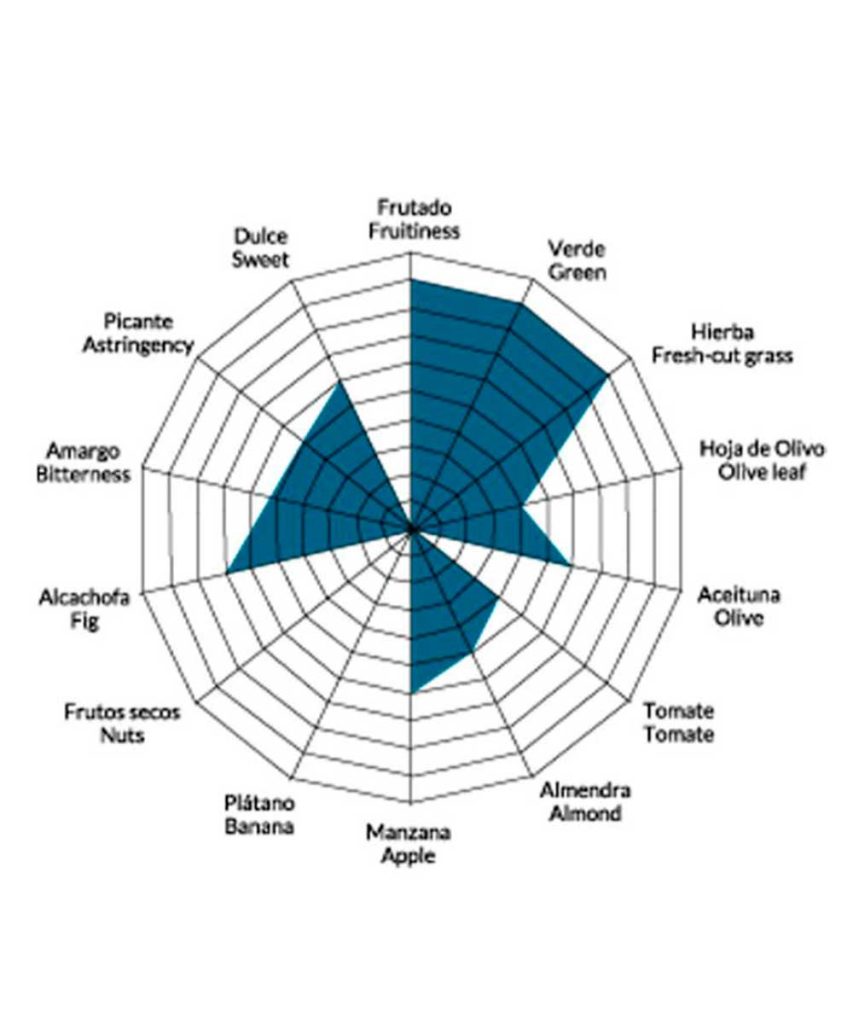 Es un aceite con cuerpo, suave y equilibrado, con aromas a verde hoja y un 10% más de ácido oleico que otras variedades.